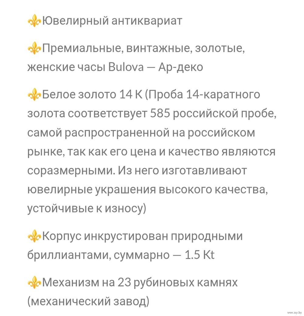 Описание дано на фото, винтажная очень редкая модель -модель аж из 1950х состояние без малейших дефектов вес 9 гр белое золото 14 К номерные все усыпаны бриллиантами очень чистые сверкают и переливаются описание есть на фото 8 чистых брил 57 граней остальные 12 граней самые большие камни по 0,25к , общий вес больше карата есть коробочка сохранена, цена на фоне цен на ювелирку (кольца и серьги) отличная, если разложить золото+брил себестоимость, а есть историч редкость и практически уникальность (есть единичное предложение этой модели в США 2000 дол) без доставки к нам