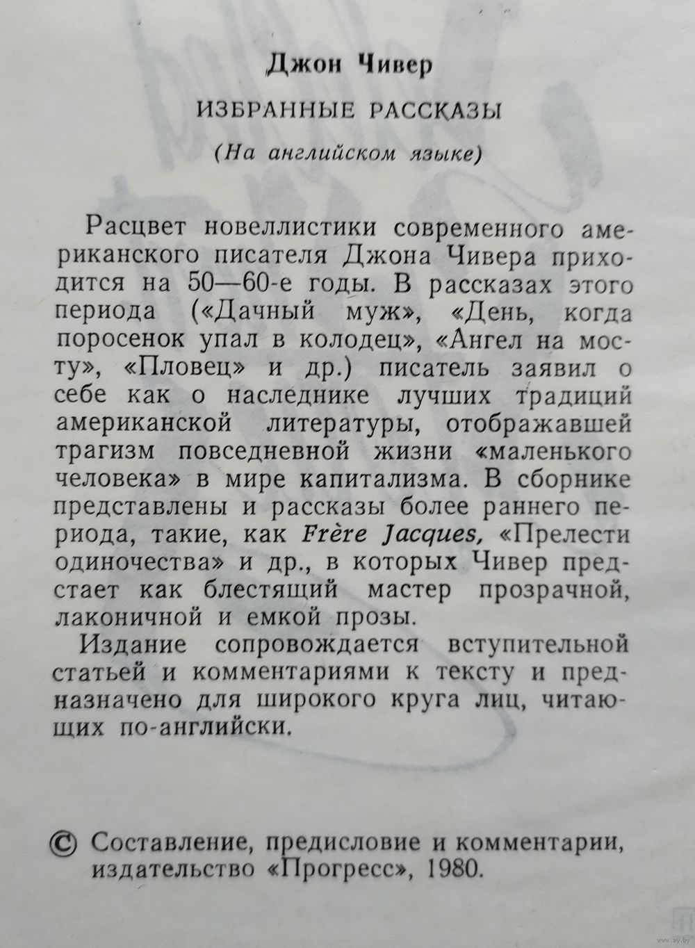 Cheever John. Selected Short Stories // Джон Чивер. Избранные рассказы. На английском языке. М.: Прогресс, 1980г., 344 с. Твёрдый переплёт, суперобложка, уменьшенный формат.