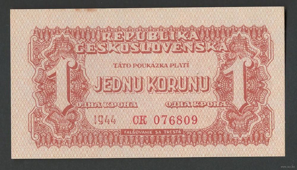 Чехословакия 1 крона 1944 года. Без перфорации. Тип Р-45. Состояние UNC