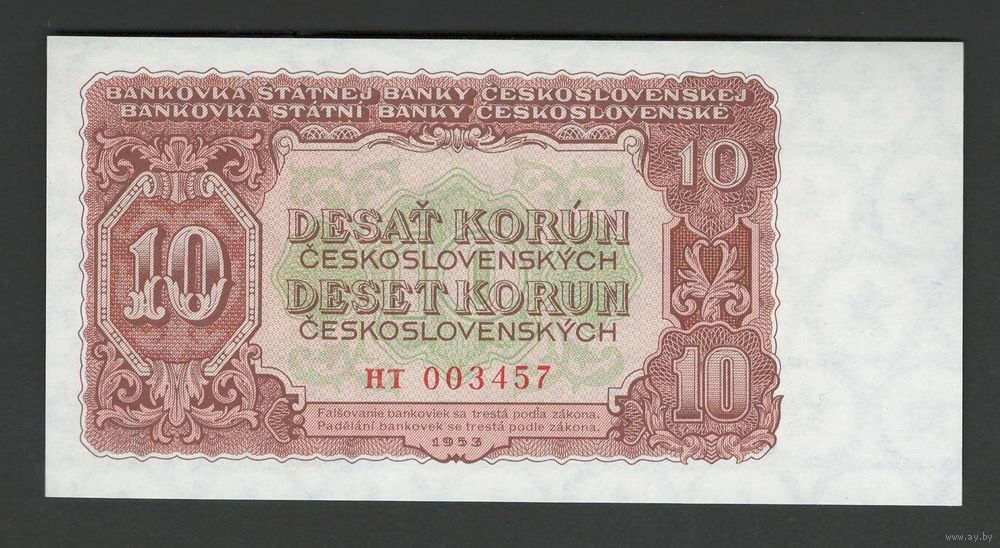 Чехословакия 10 крон 1953 года. Серия НТ. Тип Р-83b. Состояние UNC!