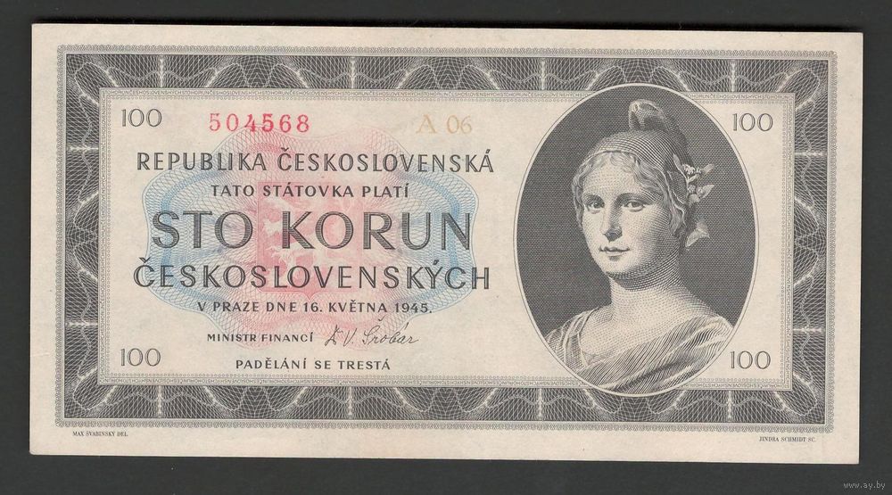Чехословакия 100 крон 1945 года. Без перфорации. Тип Р-67. Состояние аUNC