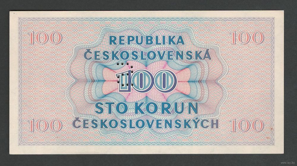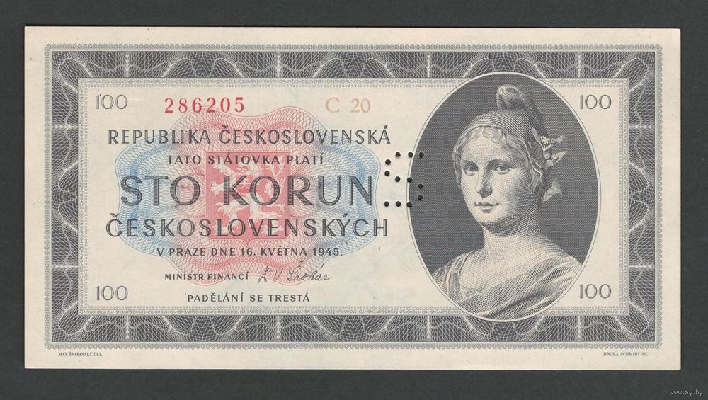 Чехословакия 100 крон 1945 года. Перфорация S. Тип Р-67. Состояние UNC