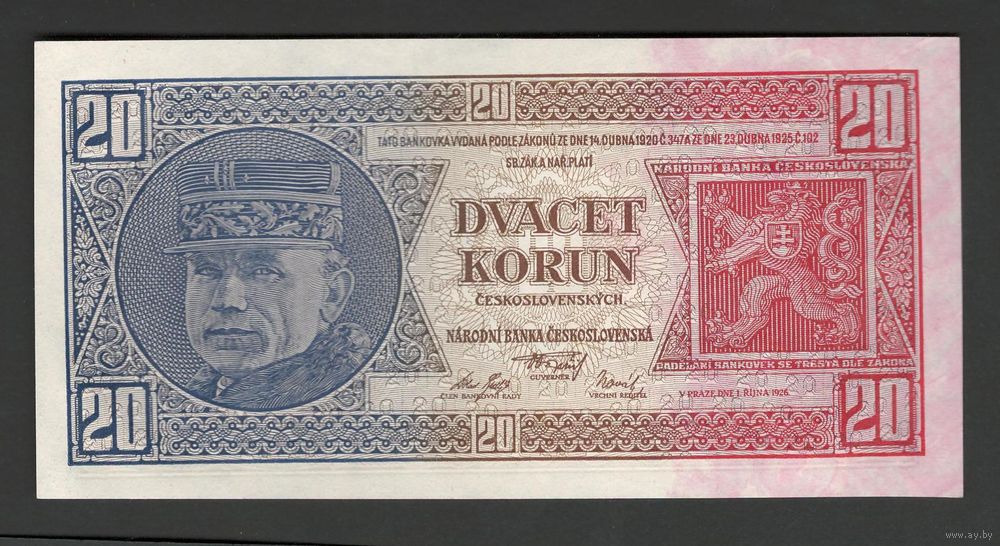 Чехословакия 20 крон 1926 года. Без перфорации. Тип Р-21. Состояние UNC