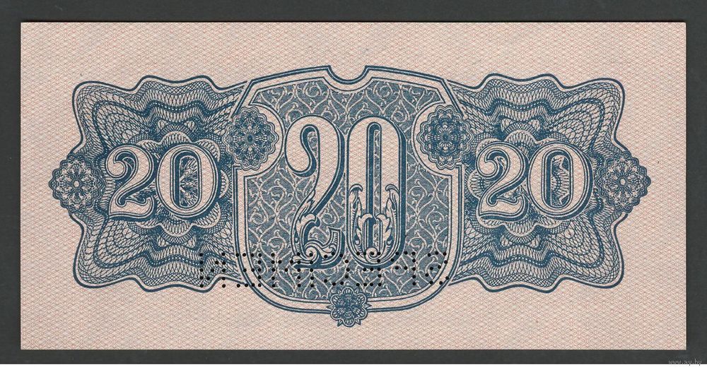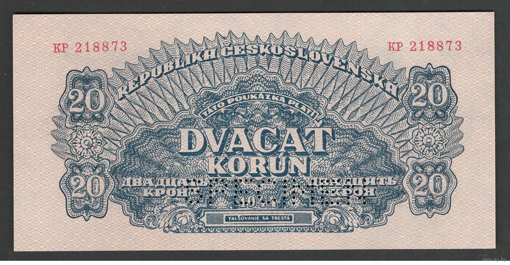 Чехословакия 20 крон 1944 года. Перфорация. Тип Р-47. Состояние aUNC