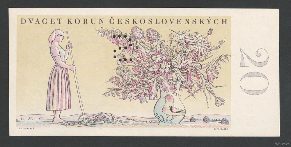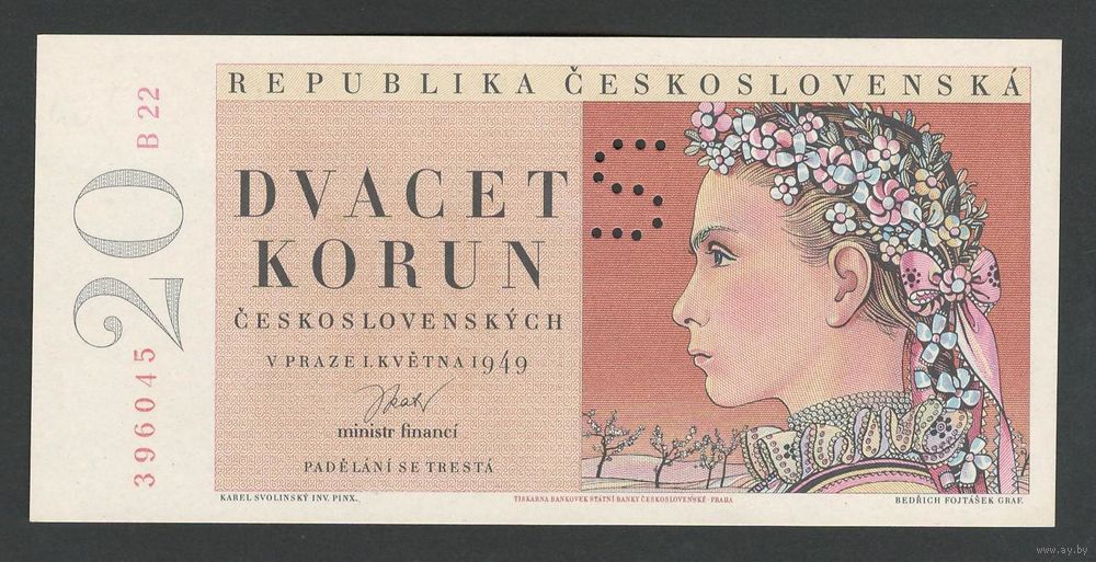 Чехословакия 20 крон 1949 года. Перфорация S. Тип Р-70b. Состояние UNC