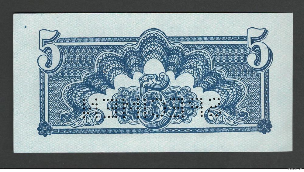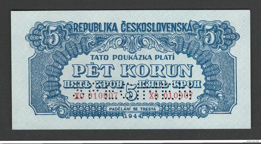 Чехословакия 5 крон 1944 года. Перфорация. Тип Р-46b. Состояние UNC