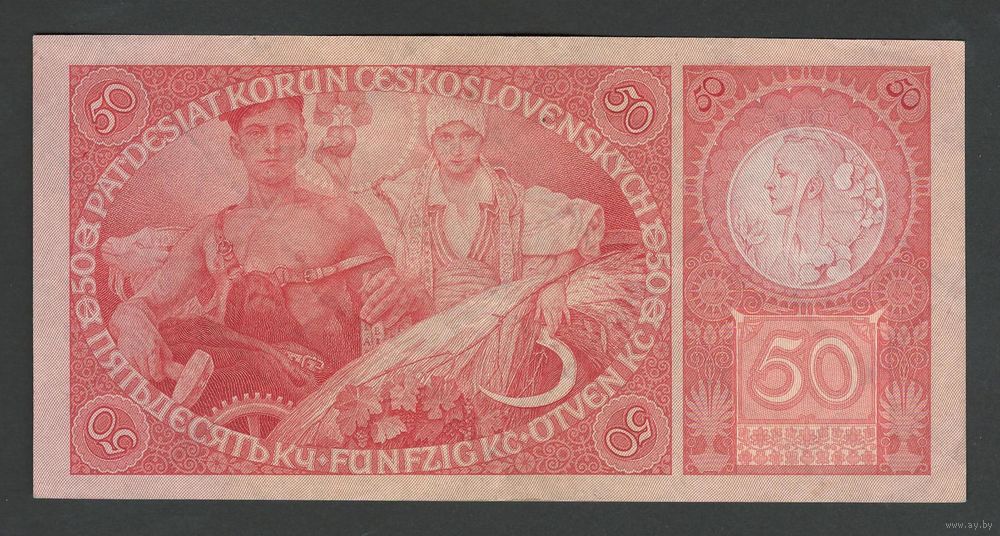 Чехословакия 50 крон 1929 года. Без перфорации. Тип Р-22. Состояние XF+