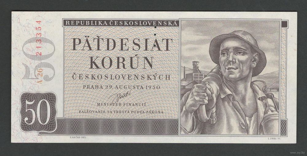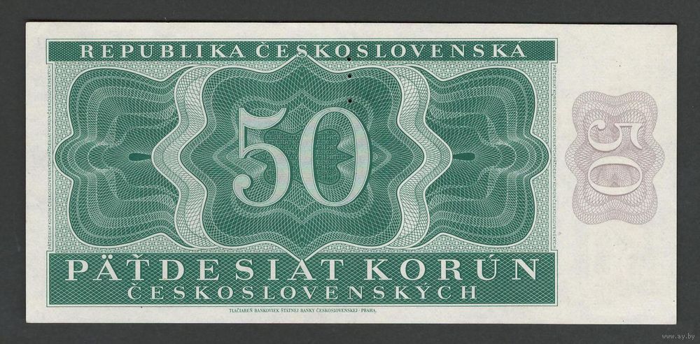 Чехословакия 50 крон 1950 года. Перфорация 3 точки. Тип Р-71a. Состояние UNC