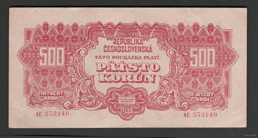 Чехословакия 500 крон 1944 года. Без перфорации. Тип Р-49. Состояние XF