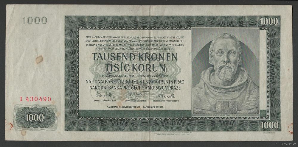 Чехословакия Богемия и Моравия 1000 крон 1942 года. Без перфорации. Тип Р-13. Состояние XF-