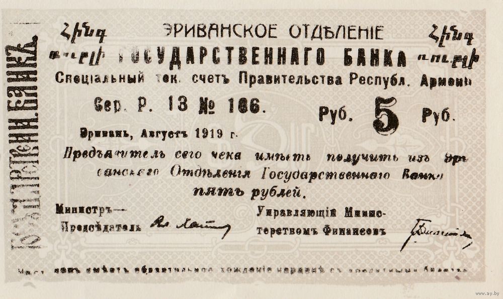 Чек Государственного банка на сумму 5 рублей 1919 год. Эриванское отделение. Республика Армения. Состояние!