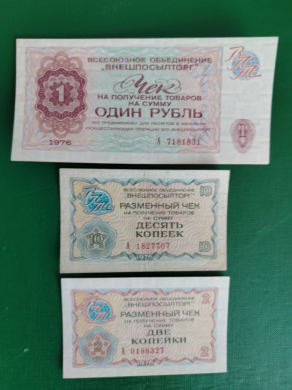 чеки 1 рубль и 2 копейки состояние unc , 10 копеек vf