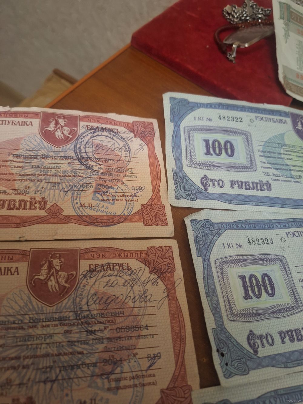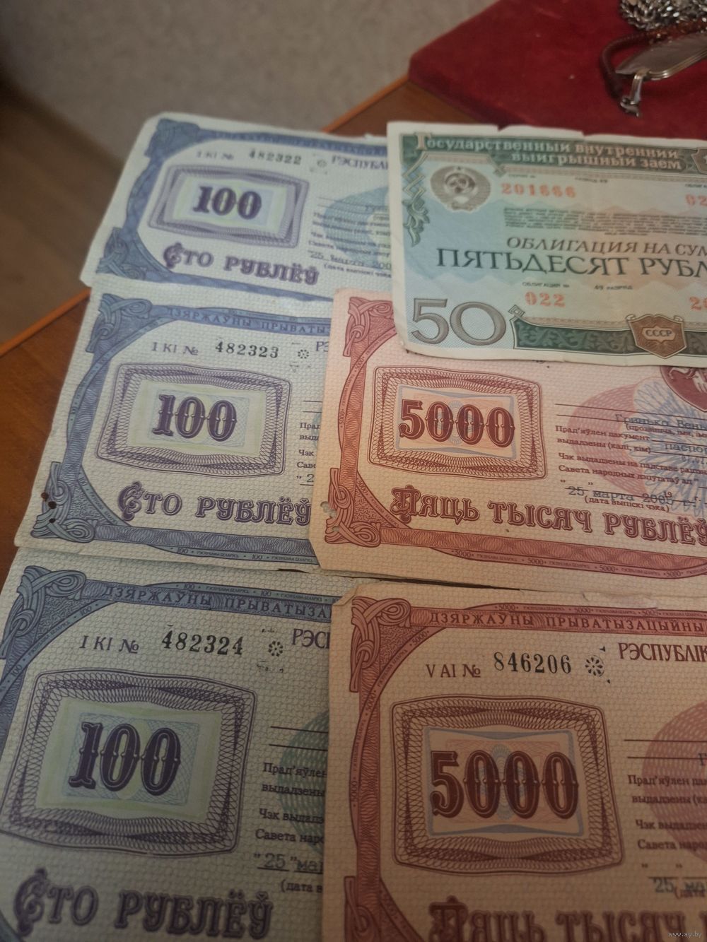 Состояние хорошее три чека по 100р 2 по 5000 и облигация 1982г на 50р