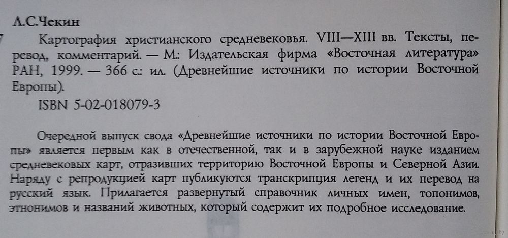 Чекин Л. Картография христианского средневековья VIII–XIII вв. Тексты. Серия: Древнейшие источники по истории народов Восточной Европы. Перевод. Комментарий. М. Восточная литература. 1999г. 368с., илл., тв переплет, ув формат.