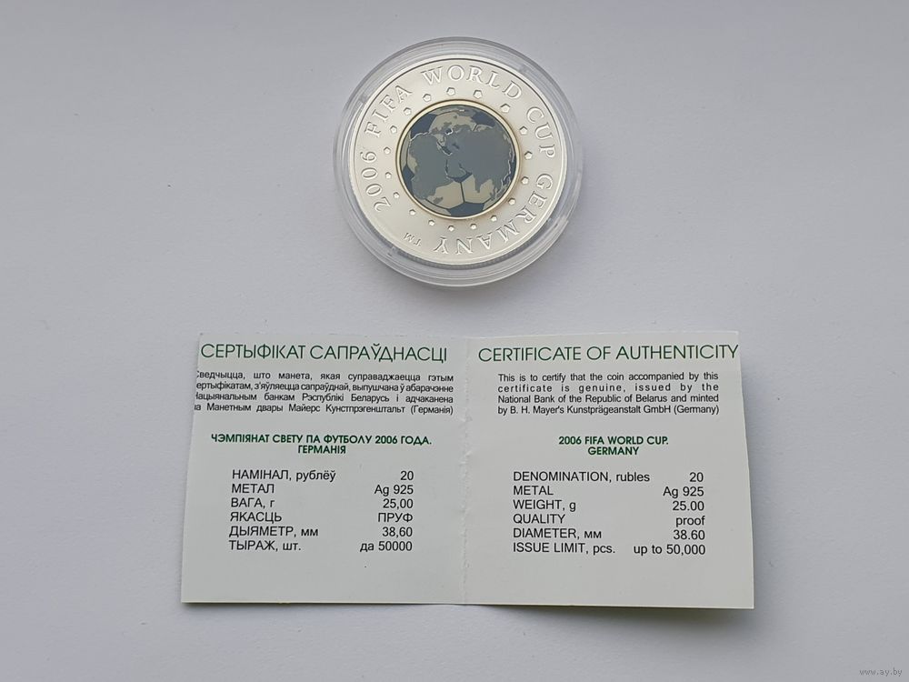 в центре – изображение футбольного мяча с нанесенным на него рисунком карты мира, выполненное тампопечатью трех цветов: черным и белым – футбольный мяч, серым – карта мира, на которой черным цветом выделена территория Германия – место проведения XVIII чемпионата мира по футболу. Вокруг футбольного мяча расположены 18 пятигранников; по кругу надпись: "2006 FIFA WORLD CUP GERMANY ™".