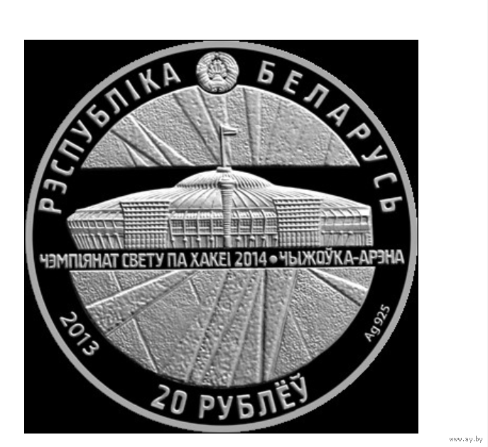 Монета имеет форму круга, с лицевой и оборотной сторон – выступающий кант по окружности. Боковая поверхность монеты с насечкой. На аверсе вверху – рельефное изображение Государственного герба Республики Беларусь; в центре на фоне ледовой площадки – изображение спортивного комплекса «Минск-Арена»; внизу в центре номинал - 20 РУБЛЁЎ. На реверсе в центре – два хоккеиста; вверху – логотип Международной федерации хоккея с шайбой. Дизайн: О. Новосёлова (Беларусь). Чеканка: АО «Монетный двор Польши», Варшава, Польша.
