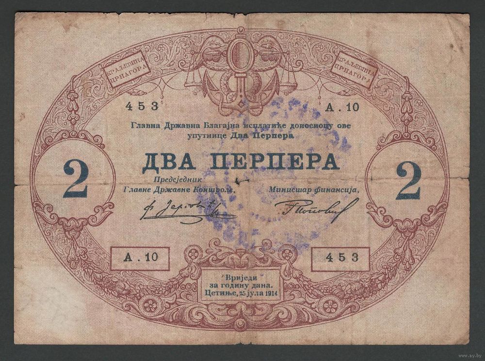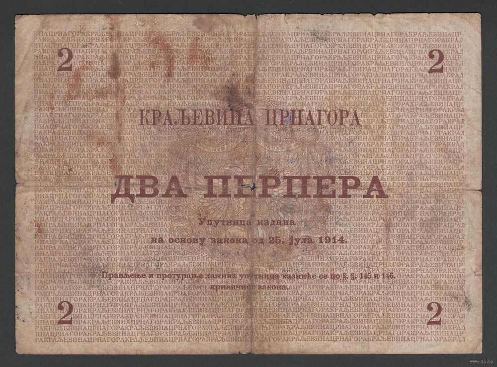 Черногория 2 перпера 1914 года. С надпечаткой. PODGORICA ? Тип P-M115. Состояние VG