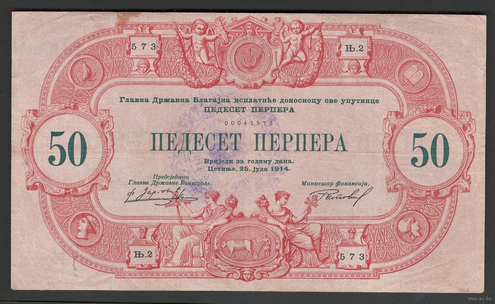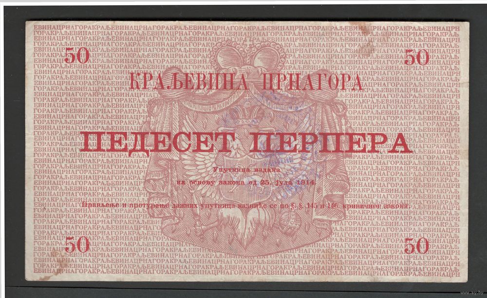 Черногория 50 перпер 1914 года. С надпечаткой. Тип Р-M71. Состояние XF