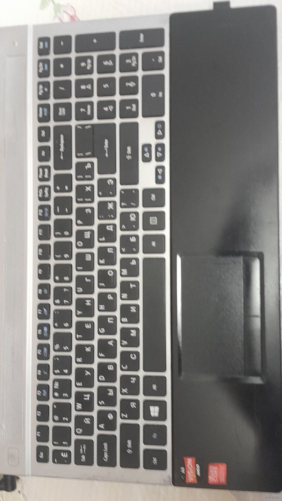 Четырех ядерный ноутбук в рабочем состоянии. Не работает тачпад. В правом верхнем углу немножко затемнен экран. В комплекте зарядка и мышка.