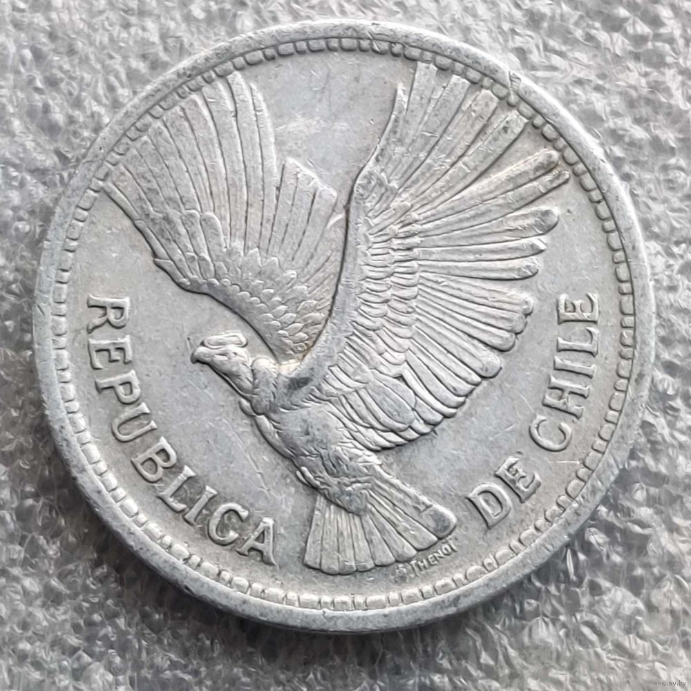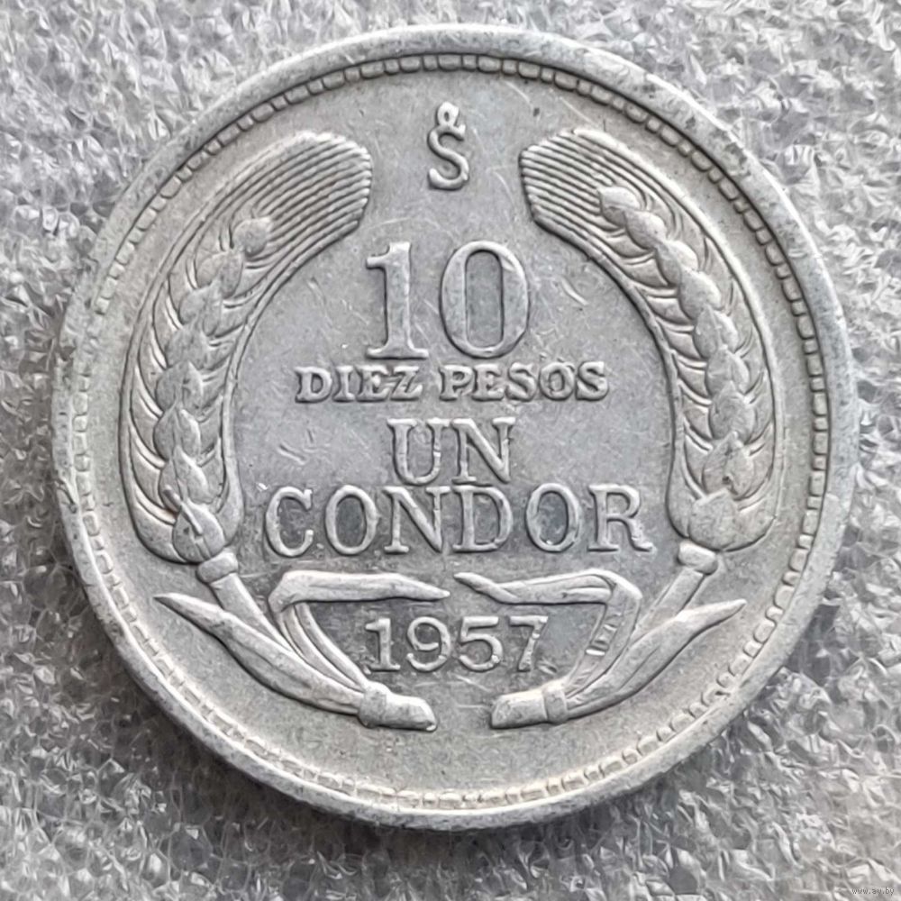 Номер KM # 181 Страна Чили Период Республика Чили (1899 - 1968) Валюта Чилийское песо Вид чекана Регулярный чекан Номинал 10 песо Год 1956 - 1959 Гурт Гладкий Форма Круг Отношение авс/рев Монетное (180°) Материал Алюминий Вес (g) 2,96 Диаметр (mm) 29 Толщина (mm) 2