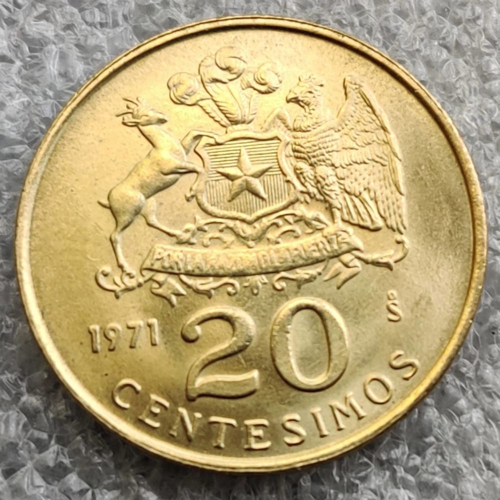 Номер KM # 195 Страна Чили Период Республика Чили (1960 - 1975) Валюта Чилийский эскудо Вид чекана Регулярный чекан Номинал 20 сентесимо Год 1971 - 1972 Гурт Гладкий Форма Круг Отношение авс/рев Монетное (180°) Материал Алюминиевая бронза Вес (g) 3,05 Диаметр (mm) 19,97 Толщина (mm) 1,4