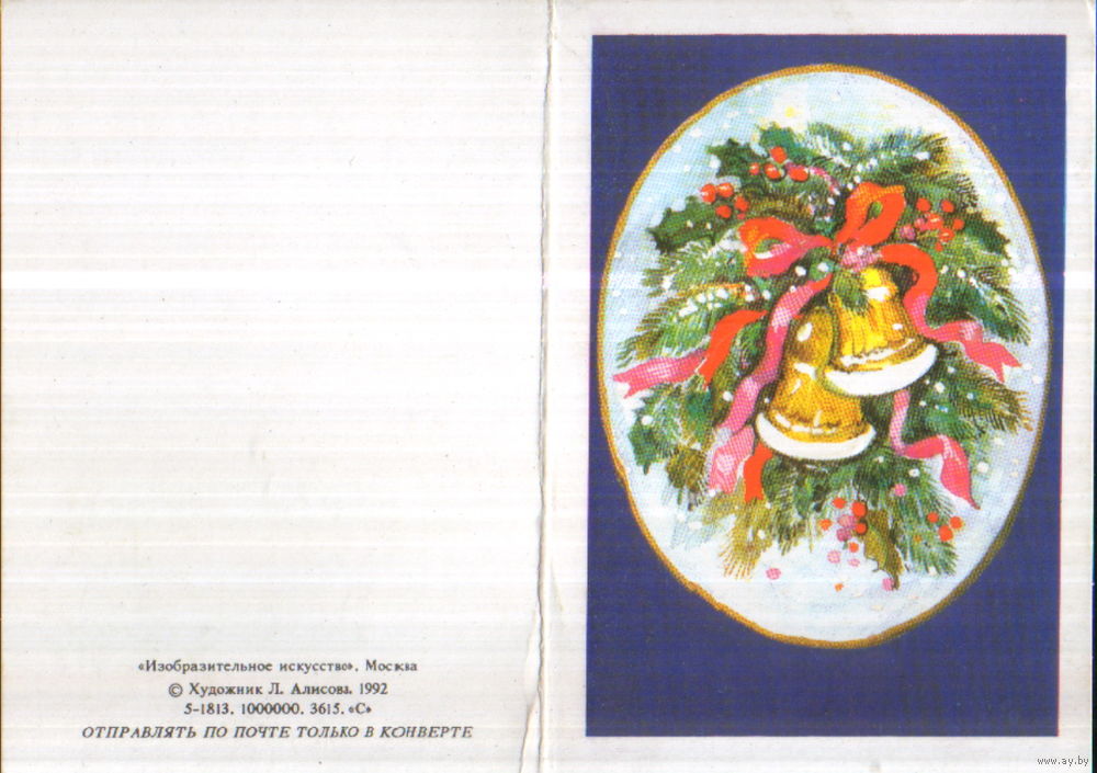 Чистая двойная мини-открытка 1992г. "С Новым годом! Колокольчики" худ. Л. Алисова