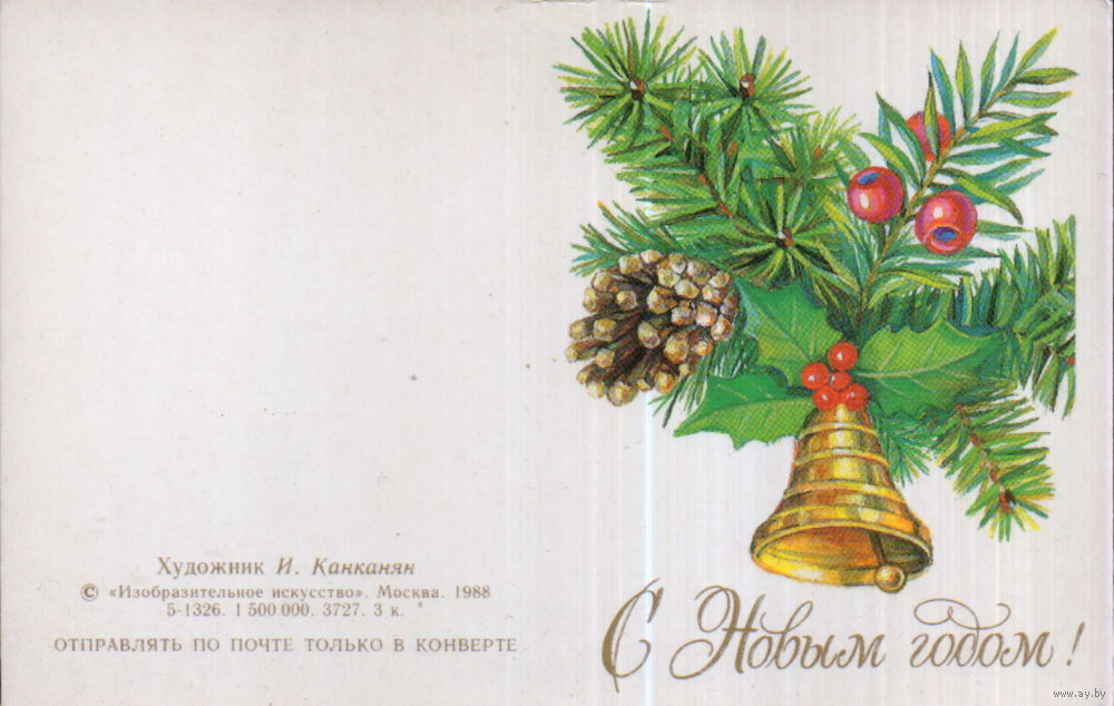 Чистая двойная мини-открытка без перегиба 1988г. "С Новым годом! Колокольчик" худ. И. Канканян