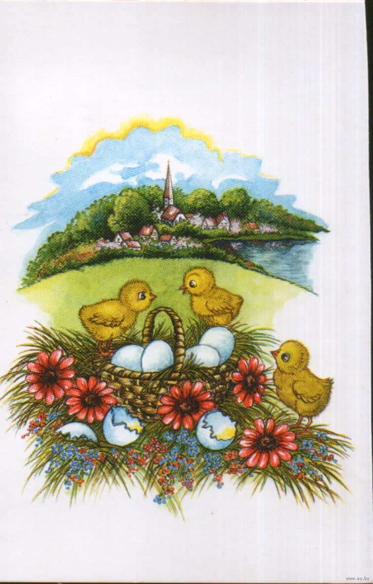 Чистая двойная открытка Латвия "Пасха. Цыплята" худ. Рамона Шнайдере