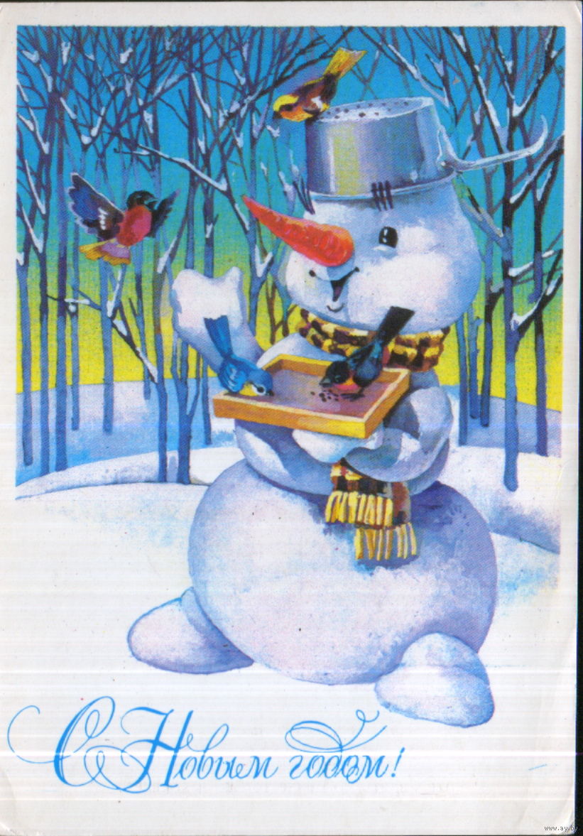 Чистая открытка 19?г. "С Новым годом! Снеговик с кормушкой" худ. Ю. Ясюкевич