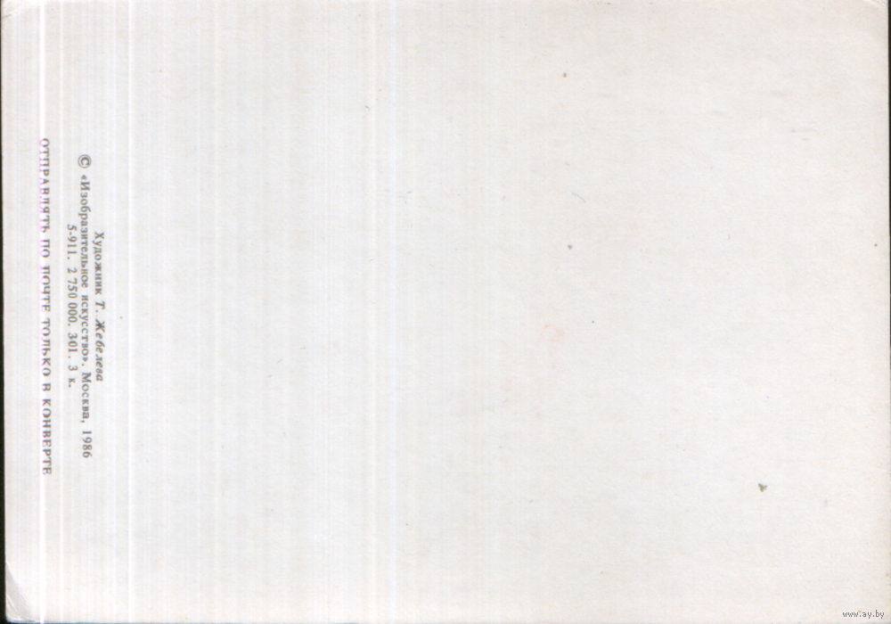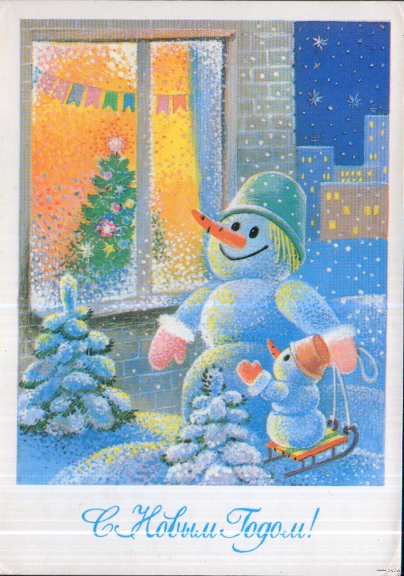 Чистая открытка 1986г. "С Новым годом! Снеговики у окна" худ. Т. Жебелева