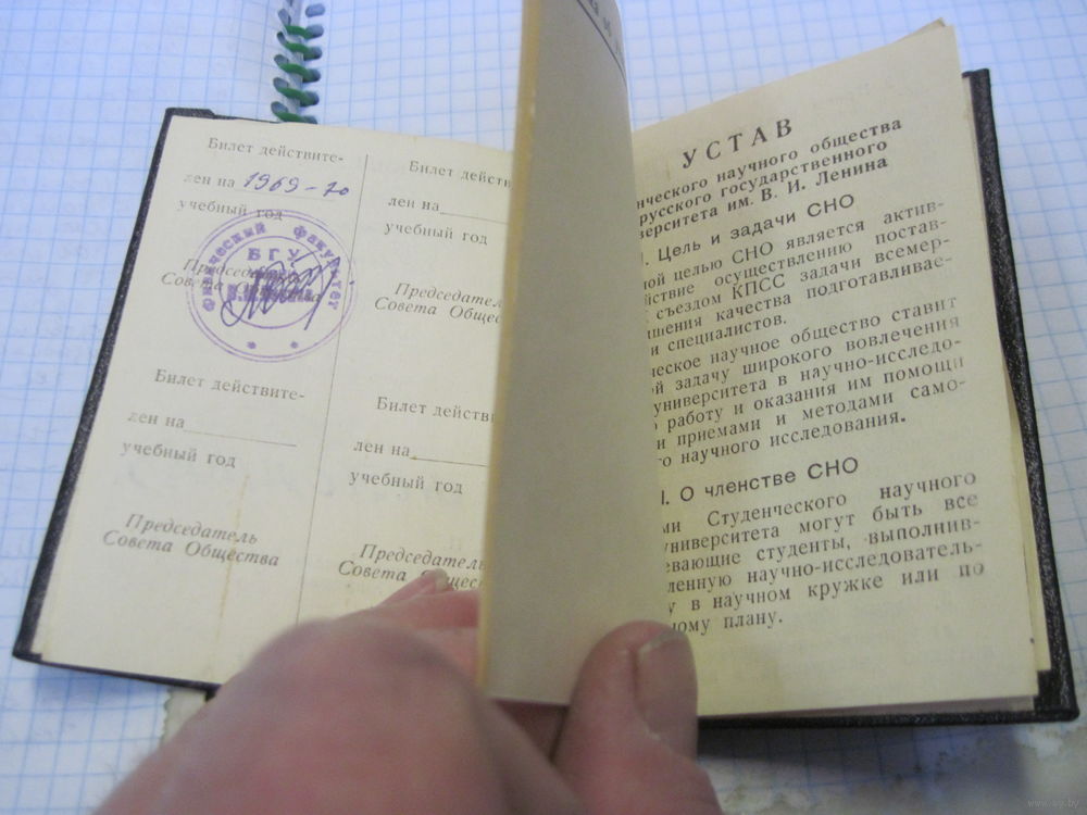 Членский билет Студенческого научного общества БГУ 1970 г. с рубля!