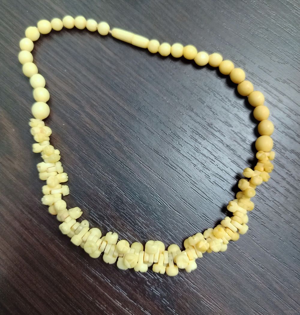 Бусы выполнены в виде ожерелья с резными элементами , эти бусы относятся к антикварным украшениям советского периода , ценятся за уникальную ручную резьбу и естественный оттенок материала . Застежка на закрутка . размер - длинна 19.5 см. вес 30 грамм . размер коробочки 8 на 5.5 см вес с коробочкой - 72 грамма .