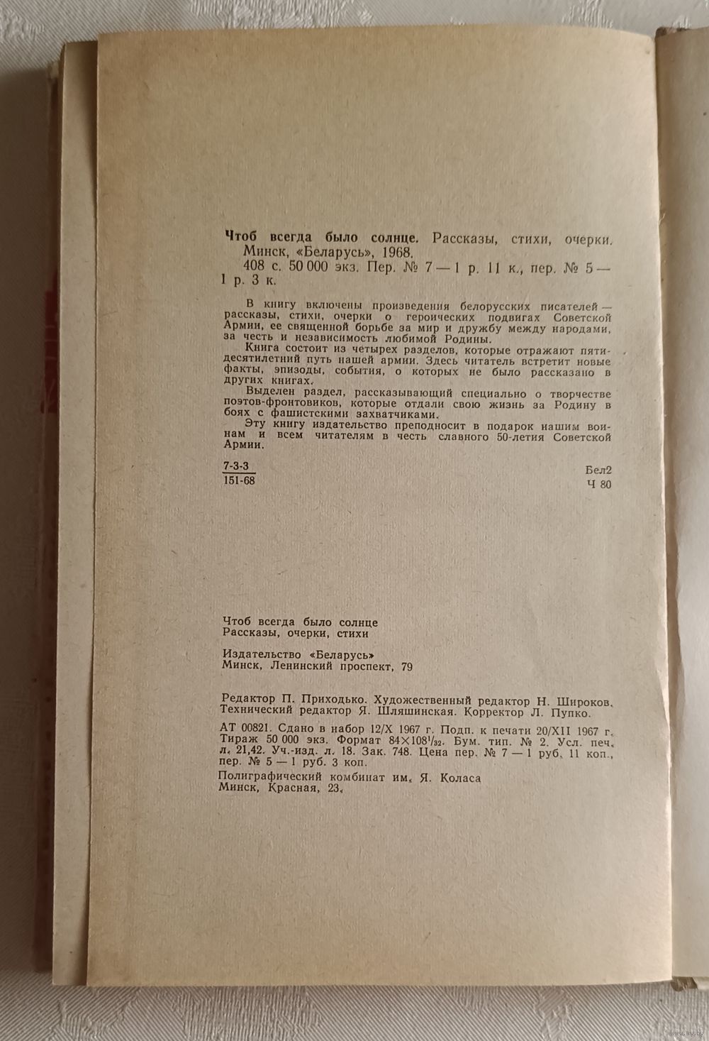 Чтоб всегда было солнце. Рассказы, стихи, очерки. Минск, «Беларусь», 1968, 408 с., твёрдый переплёт, обычный формат.