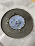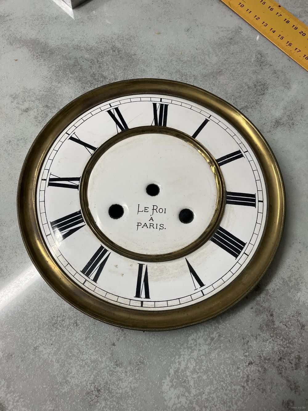 Эмалевый циферблат от настенных часов, диаметр 18,5 см, расстояния от центров между заводными отверстиями 5 см, между стрелочным и заводными 3 см.