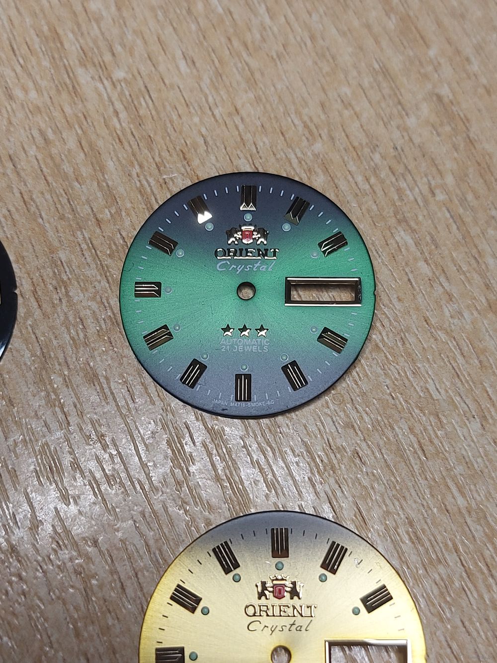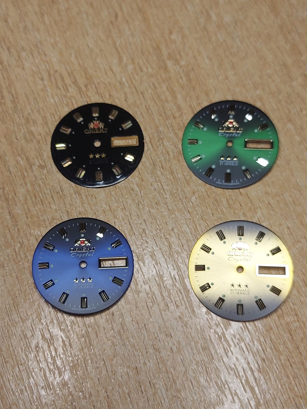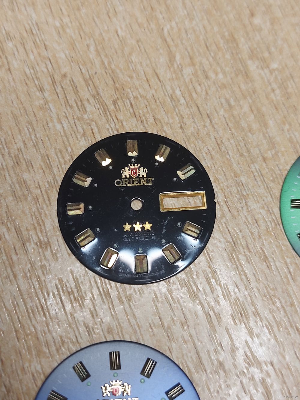 Циферблаты для часов Orient. В чёрном обломаны 2 ножки. В остальных трех обломали по 1 ножке. Состояние на фото. Цена за все