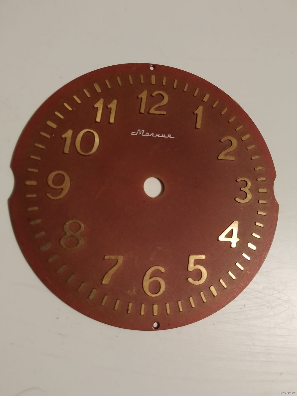 Латунный диаметром 72 мм (фото 2), от часов Молния "Мишка на бочке". Цифры и минутные деления рельефны - вычеканены изнутри. При желании слово Молния можно легко закрасить; 10 руб.