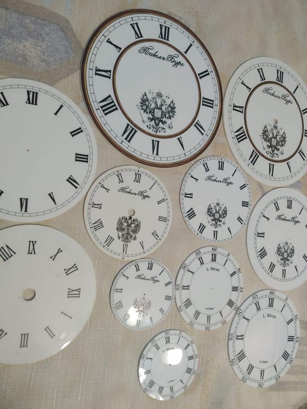 Блестящие глянцевые полимерные (почти под эмаль) (фото 5-6), с надписью Павел Буре и двуглавым орлом: диаметры 126 мм, 100 мм, 76 мм, 72 мм и 54 ми. Без орла 132 мм. Цифры и изображения нанесены рельефно, как на долларе. по 20 руб.