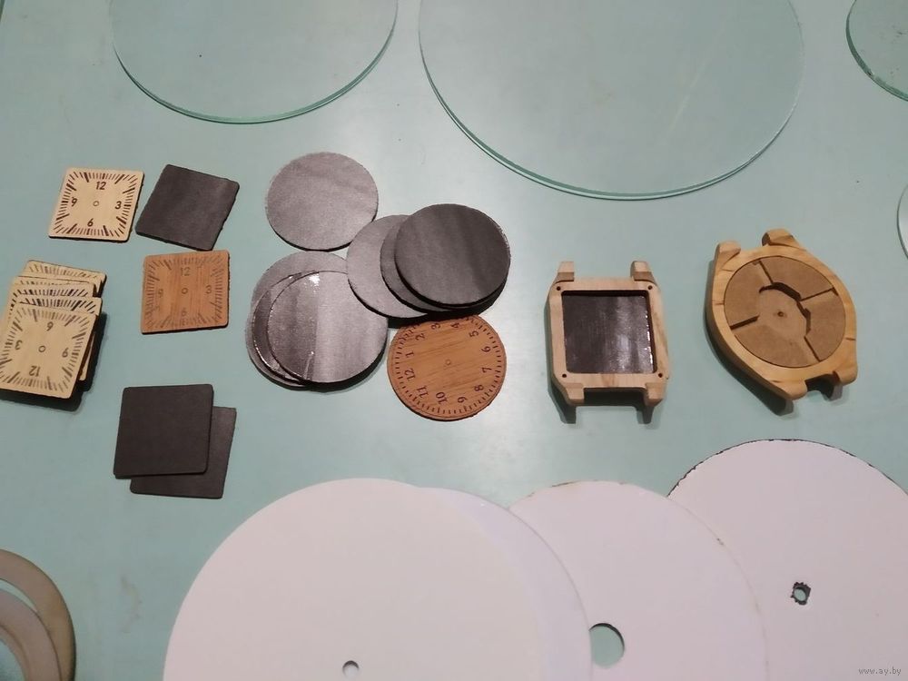 Внизу (см. также фото 5-6) - деревянные корпуса - заготовка под наручные часы. (Размеры овального 43х51. Диаметр под стекло - 35 мм. ; прямоугольного 33х44) Цена по 20 руб. и деревянные циферблаты Цена по 5руб. (Размеры круглого Ø 35мм; квадратного 36х36) Цифры и деления на циферблатах нанесены рельефно. С обратной стороны часов вставляется кварцевый или ещё какой механизм и получаются эксклюзивные наручные часы с деревянным корпусом.