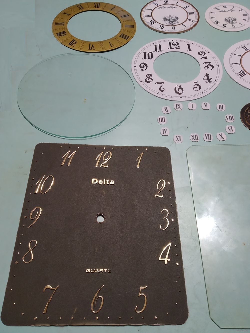 1 - прямоугольный с надписью Delta quartz - высота 230, ширина - 197, (см. также фото 2), Цифры и буквы нанесены рельефно, цена 10руб.;