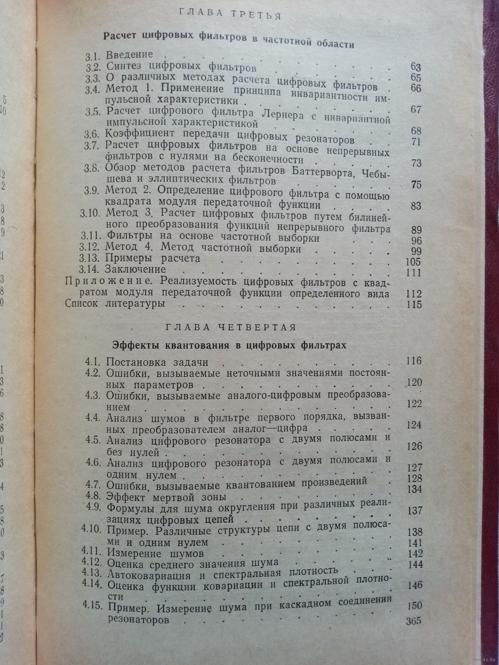 В указанных работах рассматриваются вопросы теории дискретных сигналов и дискретных цепей, методы проектирования цифровых фильтров, способы осуществления цифровой обработки на универсальных и специализированных ЦВМ и др.