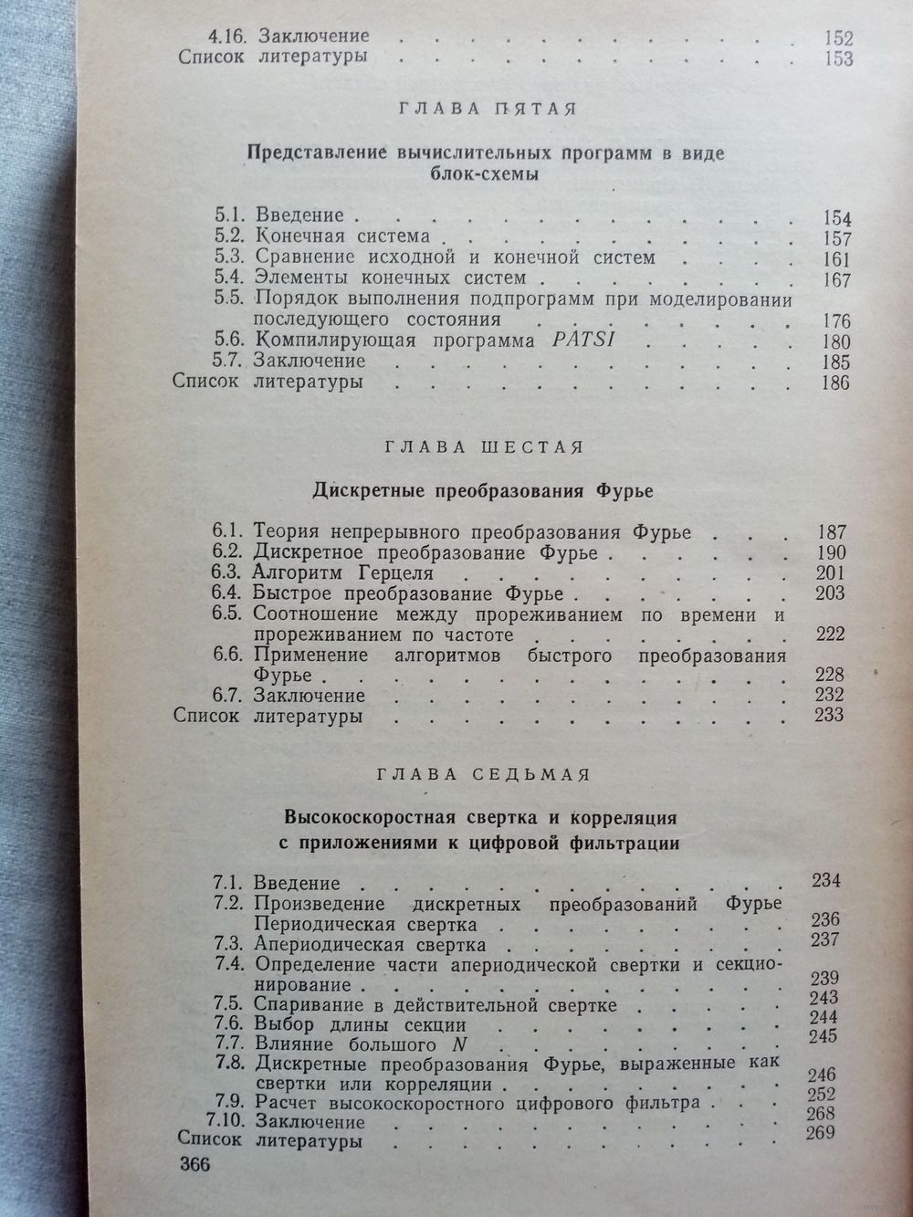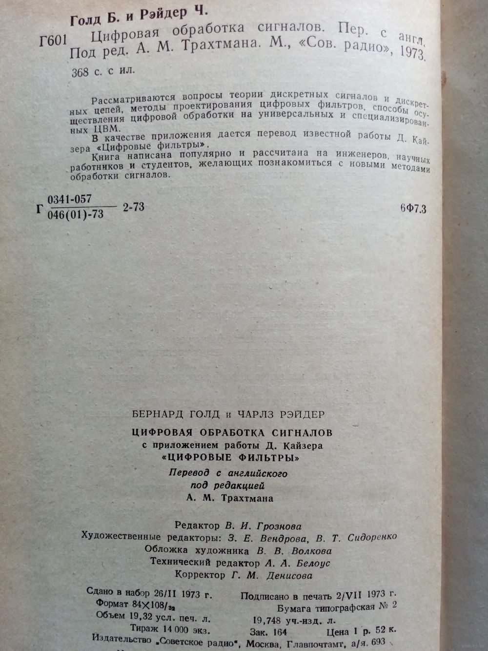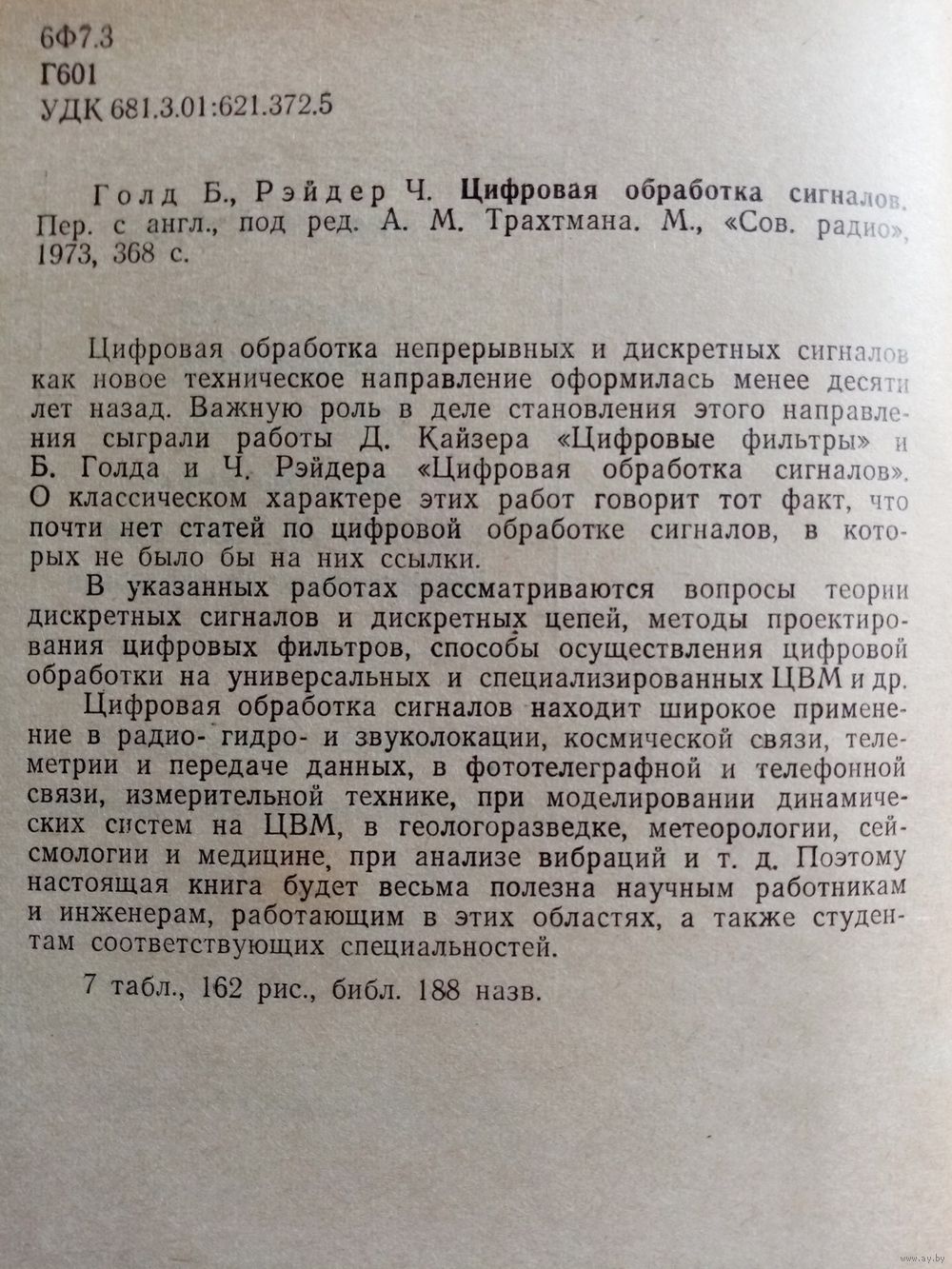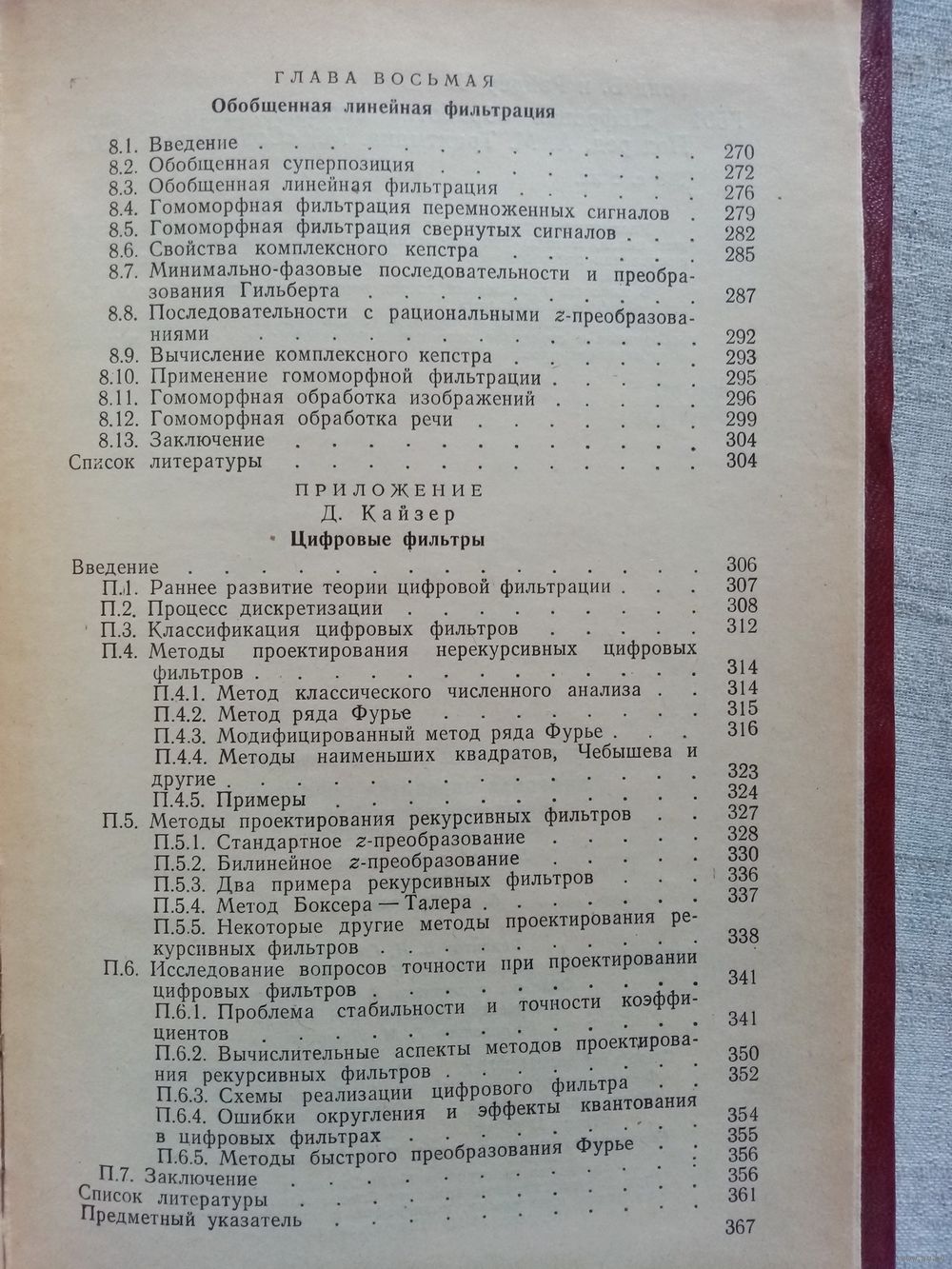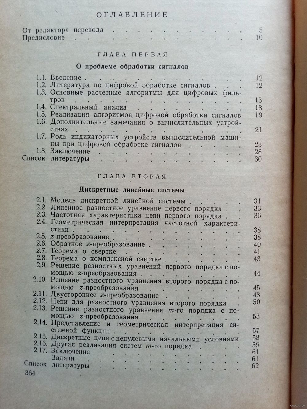 В указанных работах рассматриваются вопросы теории дискретных сигналов и дискретных цепей, методы проектирования цифровых фильтров, способы осуществления цифровой обработки на универсальных и специализированных ЦВМ и др.