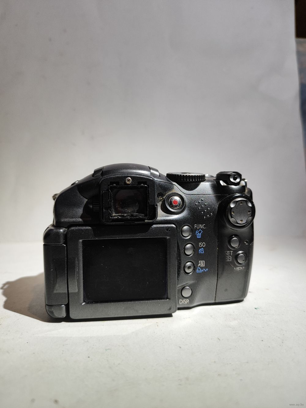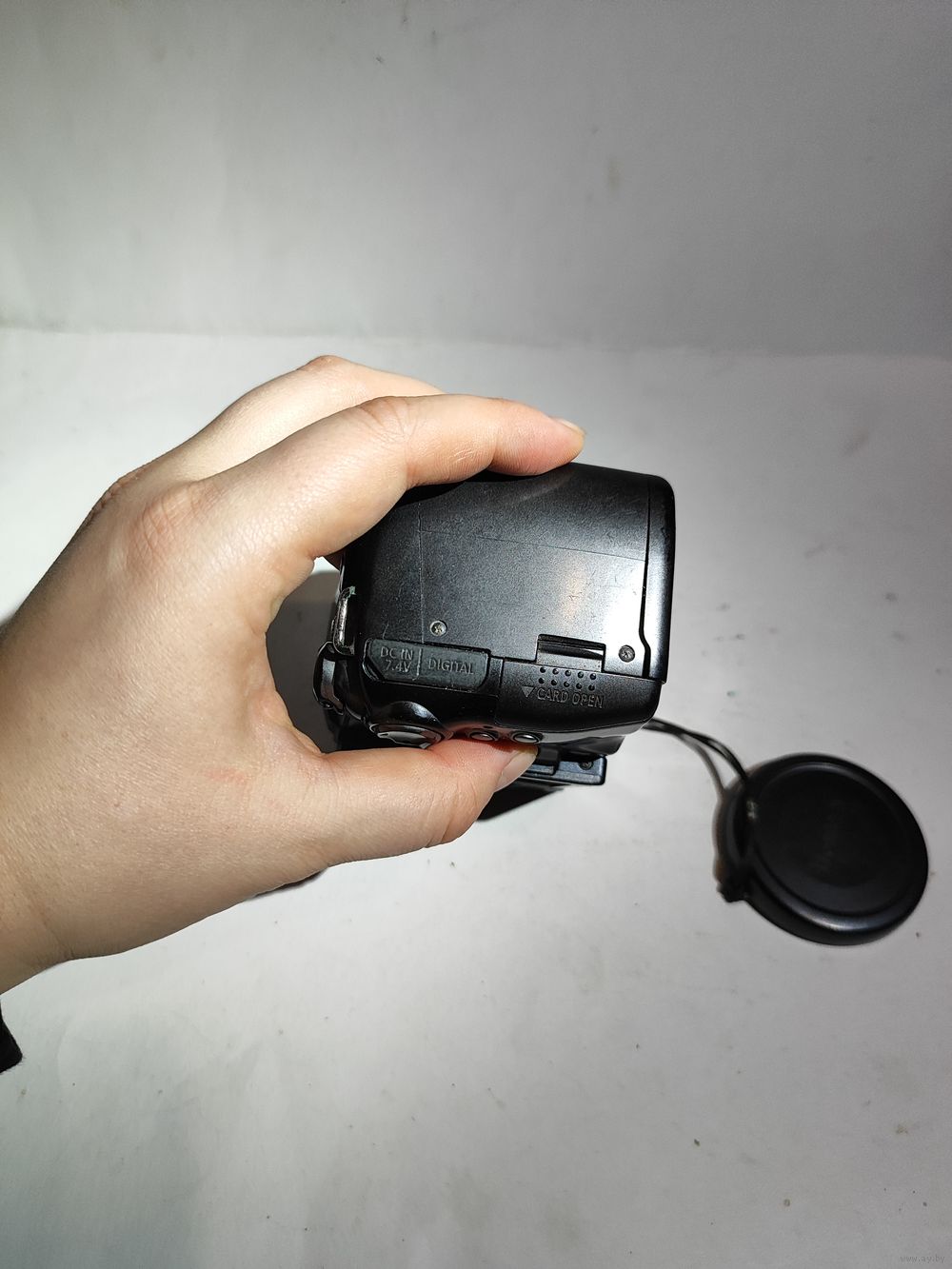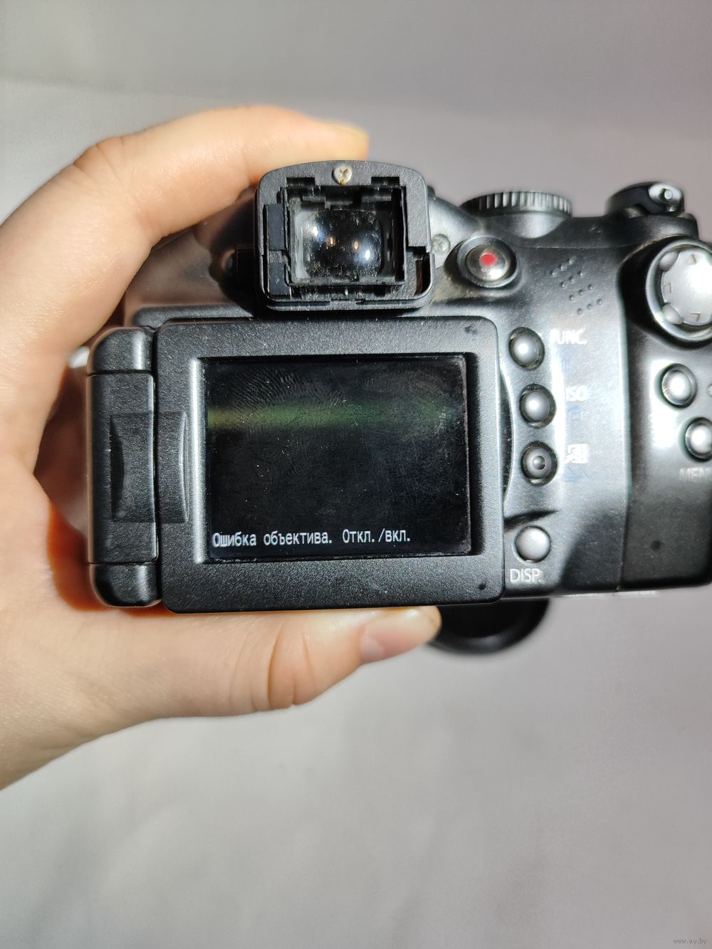 Работает от 4-х батареек (1,5 в.)..Включается но объектив не выходит. На экране загорается меню и пишет ошибка объектива. Нет карты памяти. Состояние на фото.(нет наглазника). Япония -Канада.