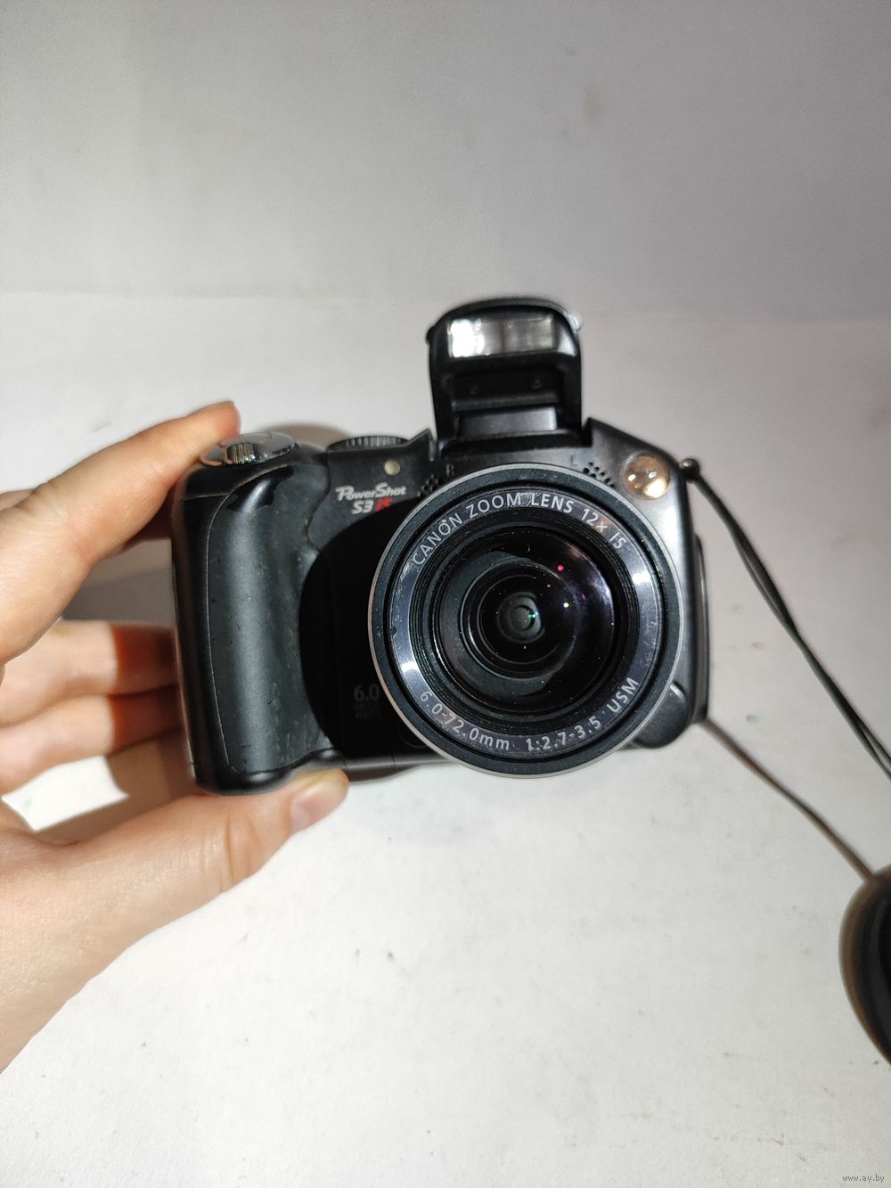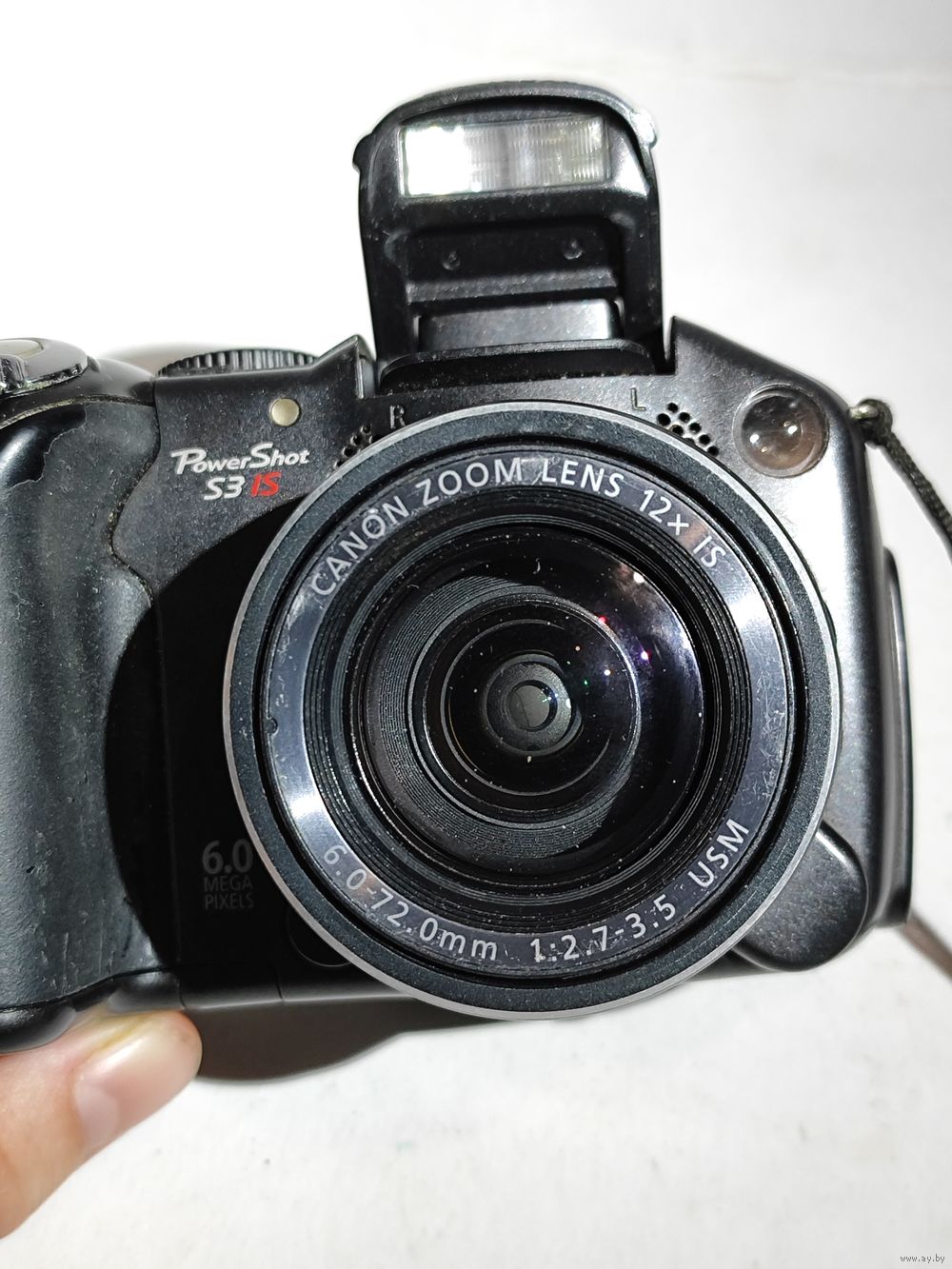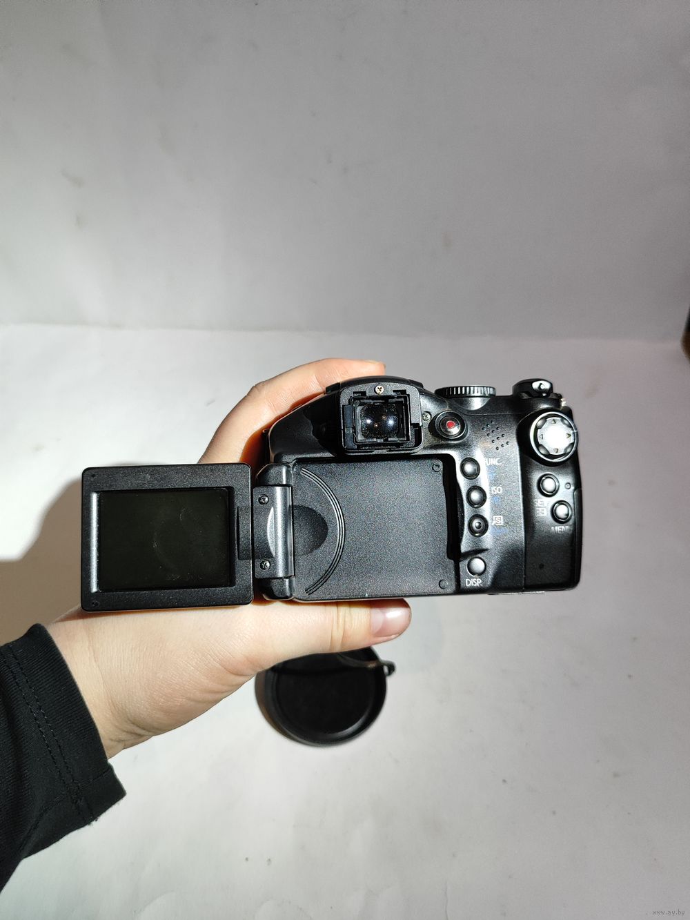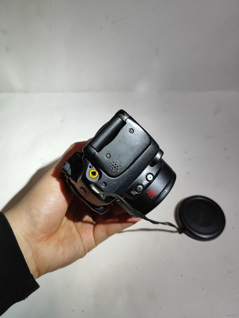 Работает от 4-х батареек (1,5 в.)..Включается но объектив не выходит. На экране загорается меню и пишет ошибка объектива. Нет карты памяти. Состояние на фото.(нет наглазника). Япония -Канада.