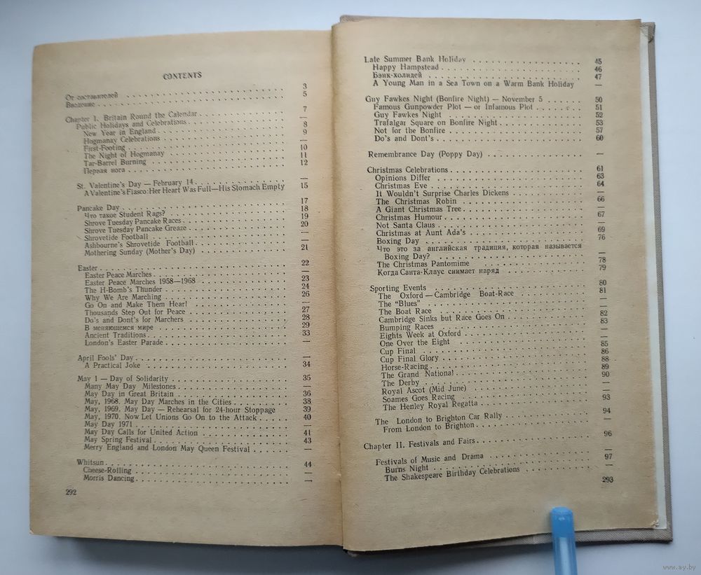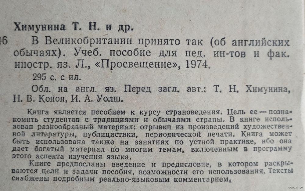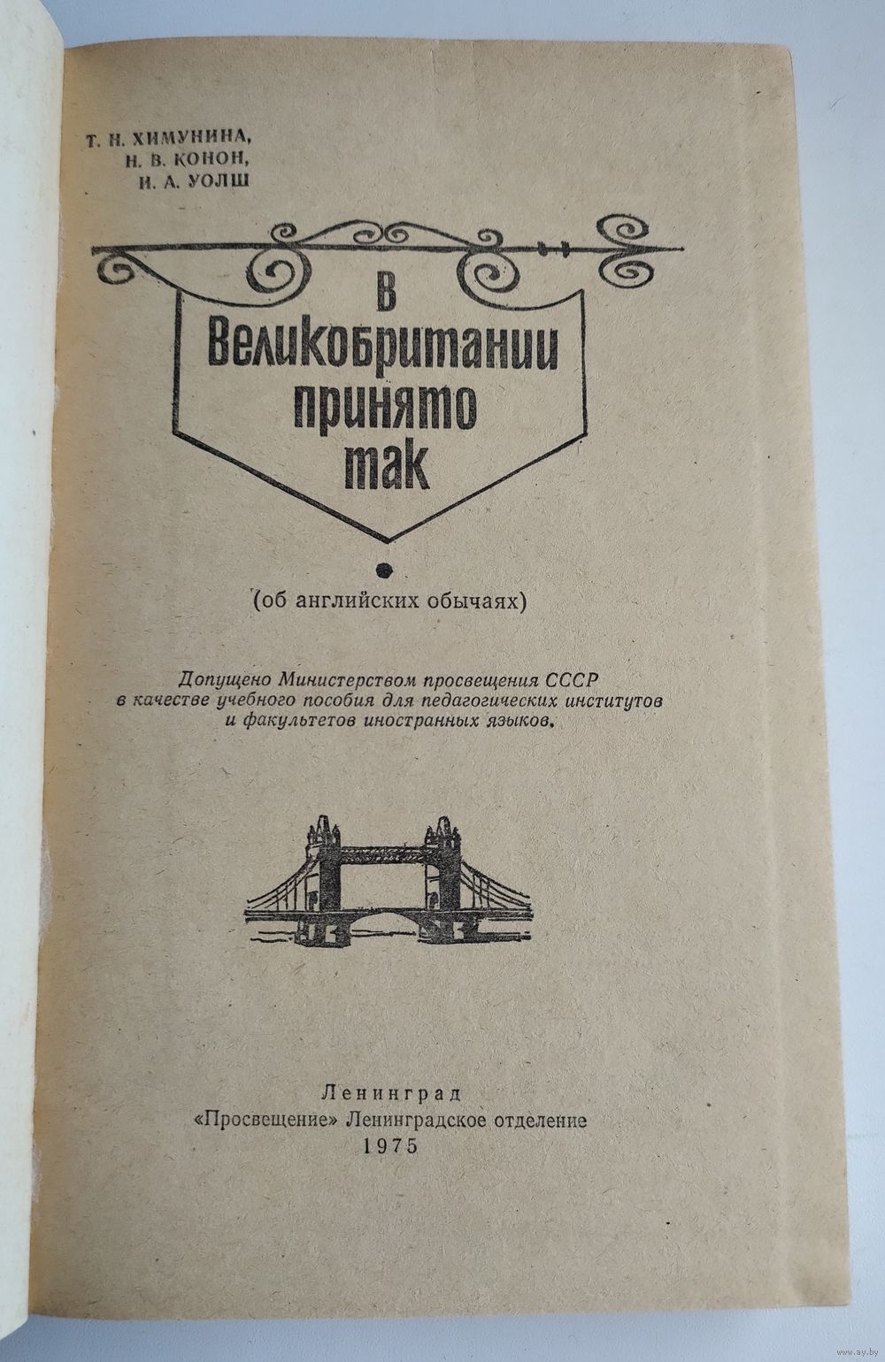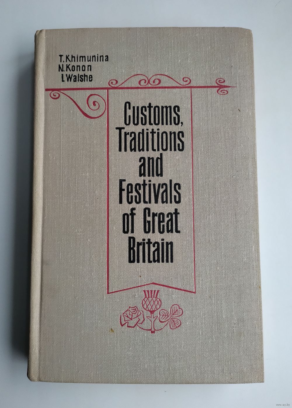 Khimunina T., Konon T., Walshe I. // Химунина Т.Н., Конон Н.В., Уолш И.А. Customs, traditions and festivals of Great Britain / В Великобритании принято так (об английских обычаях). Учебное пособие для педагогических институтов и факультетов иностранных языков. Художник М.С. Беломлинский. Ленинград: Просвещение, 1975г., 295 с., ил. Твёрдый переплёт. Обычный формат.