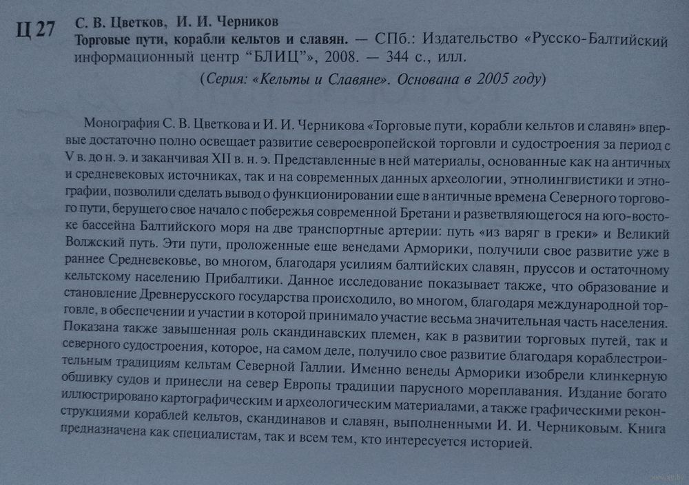 Монография С.В.Цветкова и И.И.Черникова `Торговые пути и корабли кельтов и славян` посвящена истории возникновения и развития водных торговых путей и кораблестроения за более чем тысячелетний период: с античных времен до эпохи Средневековья. В этом фундаментальном труде впервые в отечественной литературе проанализировано создание североевропейских водных международных торговых путей, первопроходцами которых были кельты, жившие на территории Северной Франции. Наследниками их торговых маршрутов, в частности, Великого Волжского пути и пути `из варяг в греки` стали балтийские славяне, названные в древнерусских летописях варягами. В книге убедительно показано, что становление и развитие Древнерусского государства шло при непосредственном активном участии балтийских славян и что основным занятием наших предков была международная торговля, определявшая как внешнюю, так и внутреннюю политику средневековой Руси. В данной книге впервые выполнен комплексный анализ возникновения и развития строительства и эксплуатации боевых и торговых кораблей кельтов, скандинавов и славян в прибрежных и речных бассейнах Балтийского моря и Атлантического океана, выявлены основные тенденции в развитии торговых путей, а также традиции кораблестроения Древней Руси. Особый интерес представляет реконструкция древних кораблей и научная гипотеза о конструктивных особенностях кельтского судостроения, показывающая, что североевропейское судостроение основано на судостроительных традициях кельтов. Издание снабжено большим количеством иллюстраций, многие из которых публикуются впервые. Книга рассчитана как на специалистов, так и на тех, кто интересуется отечественной и европейской историей.