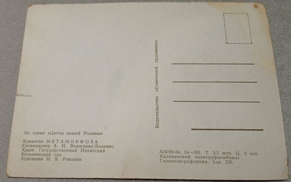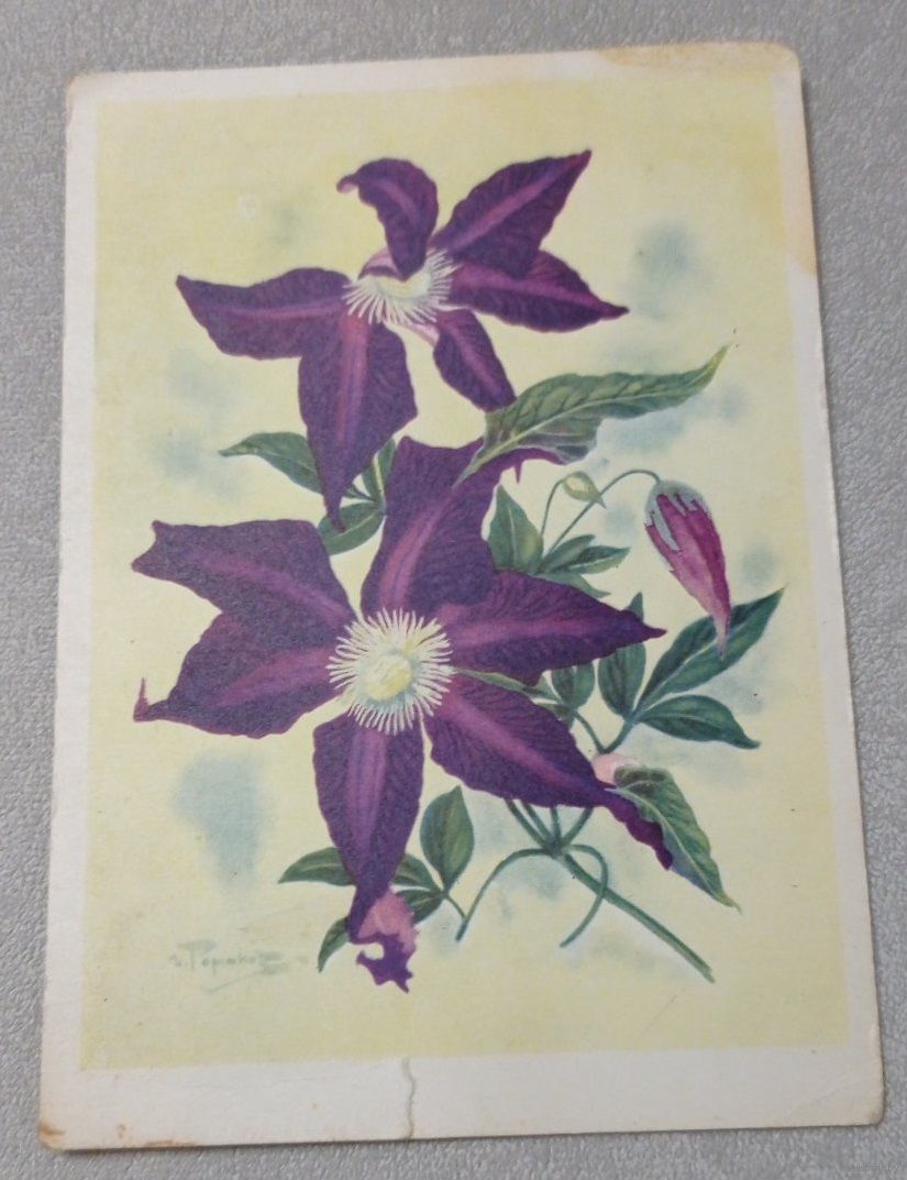 Цветы: клематис Метаморфоза. Художник И.Я.Романов. Чистая, 1964, издательство "Советский художник". Передача в Витебске возле ратуши. Пересылка в другой город за счёт покупателя по тарифам Белпочты либо Европочты после 100% предоплаты.