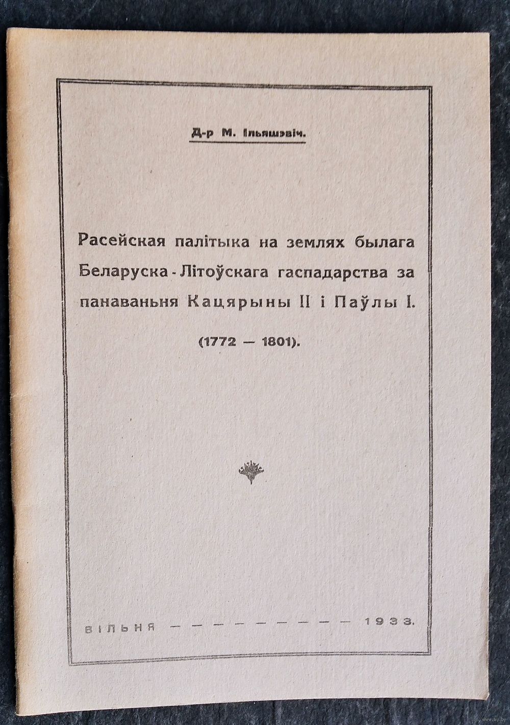 Д-р М.Ільяшэвіч. Расейская палітыка на землях былога Беларуска-Літоўскага гаспадарства за панаваньня Кацярыны ІІ і Паўлы І. (1772-1801). Вільня 1933г. (Факсімільнае выданне 1992 г.) Мн. 1992 г. 24 с. Мяккая вокладка