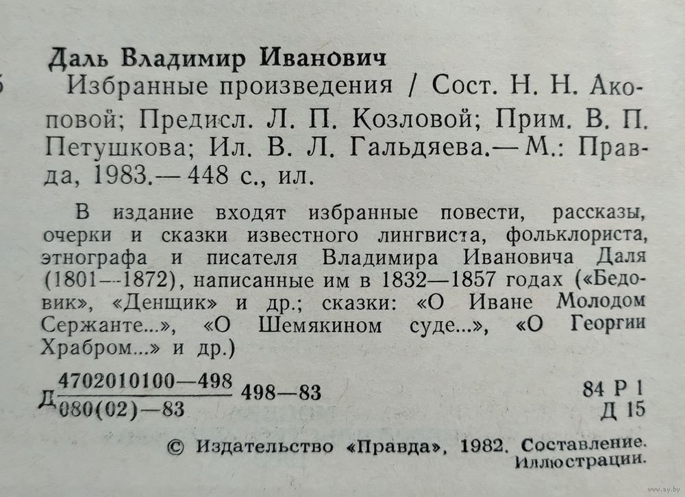 Даль В.И. Избранные произведения. Сост. Н.Н. Акопова. Предисловие Л.П. Козлова. Примечания В.П. Петушкова. Иллюстрации графика В.Л. Гольдяева. М.: Правда, 1983г. 448с., ил., портрет, художественные форзацы. Твёрдый переплёт. Обычный формат.