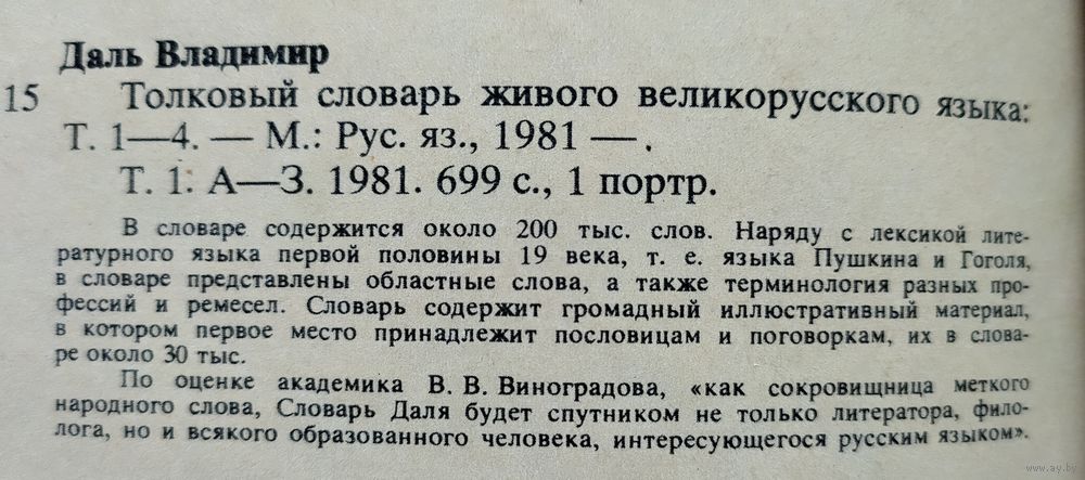 Даль Владимир Иванович. Толковый словарь живого великорусского языка. В 4-х тт. Тома 1-4. М.: Русский язык. 1978-1982г. 699, 779, 555, 683 с., портрет. Твёрдый переплёт, обычный формат.