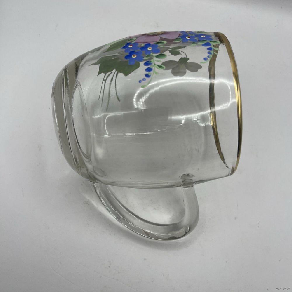 Винтажная дамская кружка для пива из толстого стекла, ручная роспись цветами и золотой ободок в качестве декора. Германия. 1950-е г.г. Ручная гравировка объема. Высота 11 см, объем 0,5 л. Ширина по ручке 14 см.